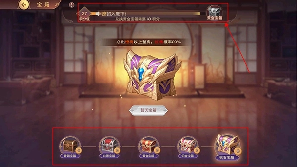 4、玩家可通过通关关卡、离线挂机、参与活动等途径获取宝箱,开启宝箱有机会得到武将,同时开启宝箱还能累积积分,当积分达到满额时,就能领取额外的宝箱奖励。