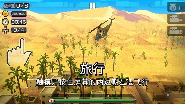 虽然游戏画面以像素风格呈现,但是细节处理还是非常用心的,树木河流等远近景物的层次感,直升机飞行扇叶的旋转导致地面出现灰尘飞舞的效果,战士中弹药火力爆炸特效等这些细节表现都十分优秀,从视觉上带给玩家们一种颇为热血的战斗救援过程。游戏在操作上采用全屏点击的方式,玩家们双手一起按住屏幕左右则可以控制直升机起飞,单独按住屏幕左边或右边可以控制飞行方向,用手指左右滑动屏幕则可以控制直升机转向。