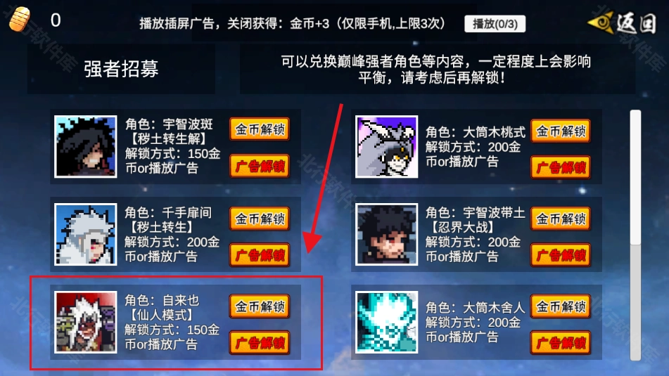 2、在下方能看到“仙人自来也”这个角色,它可以通过消耗金币解锁,也能通过观看广告解锁(这里建议直接选择看广告解锁,因为广告时长仅十几秒)