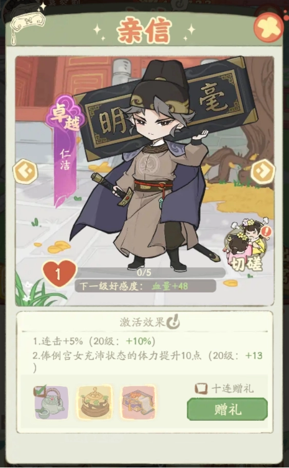 赠送礼物能够增加亲信的好感度,进而相应地提升其属性与天赋数值。