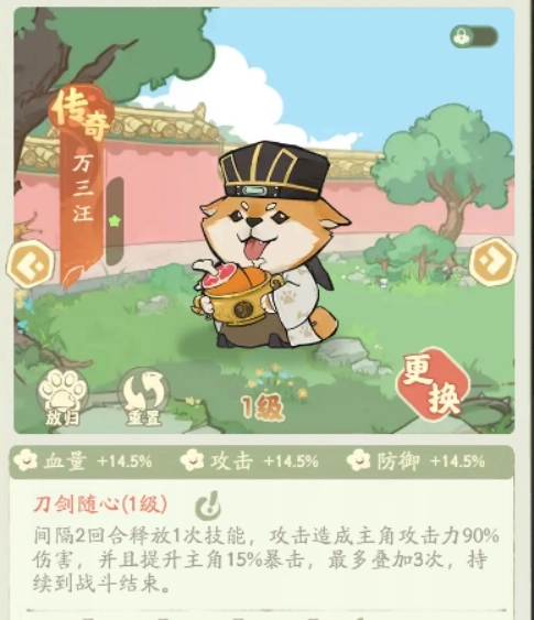 其次也可以选择戏子汪,它的技能机制为:每间隔4回合释放一次技能,攻击时能造成相当于主角攻击力95%的伤害,同时还会提升主角下回合10%的攻击与防御属性。和神话品质的跟宠相比,它的培养资源消耗要低得多,性价比十分突出。