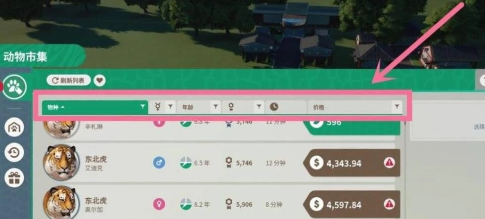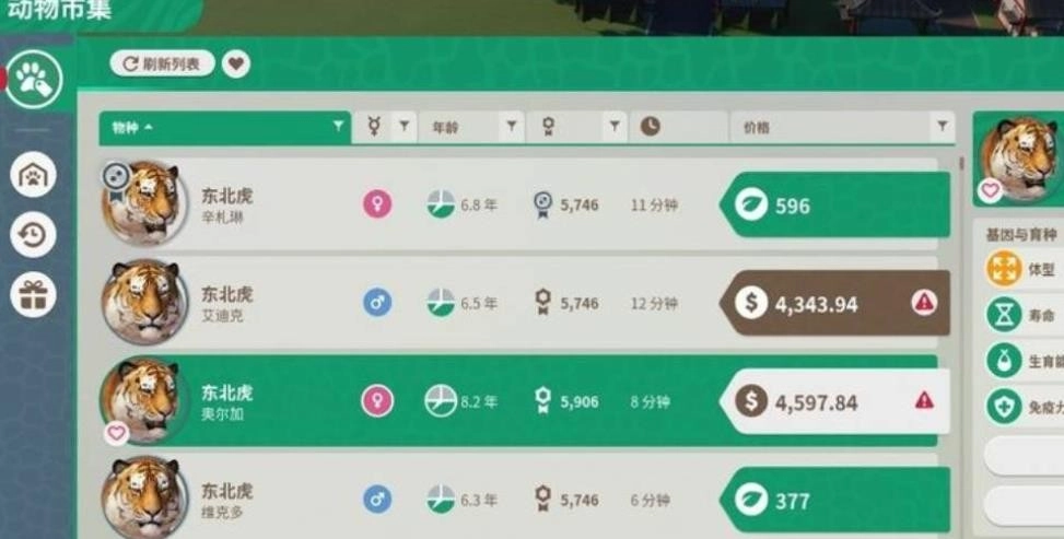 在动物交易界面,您能够自由筛选动物,当找到合适的动物时,点击该动物即可。