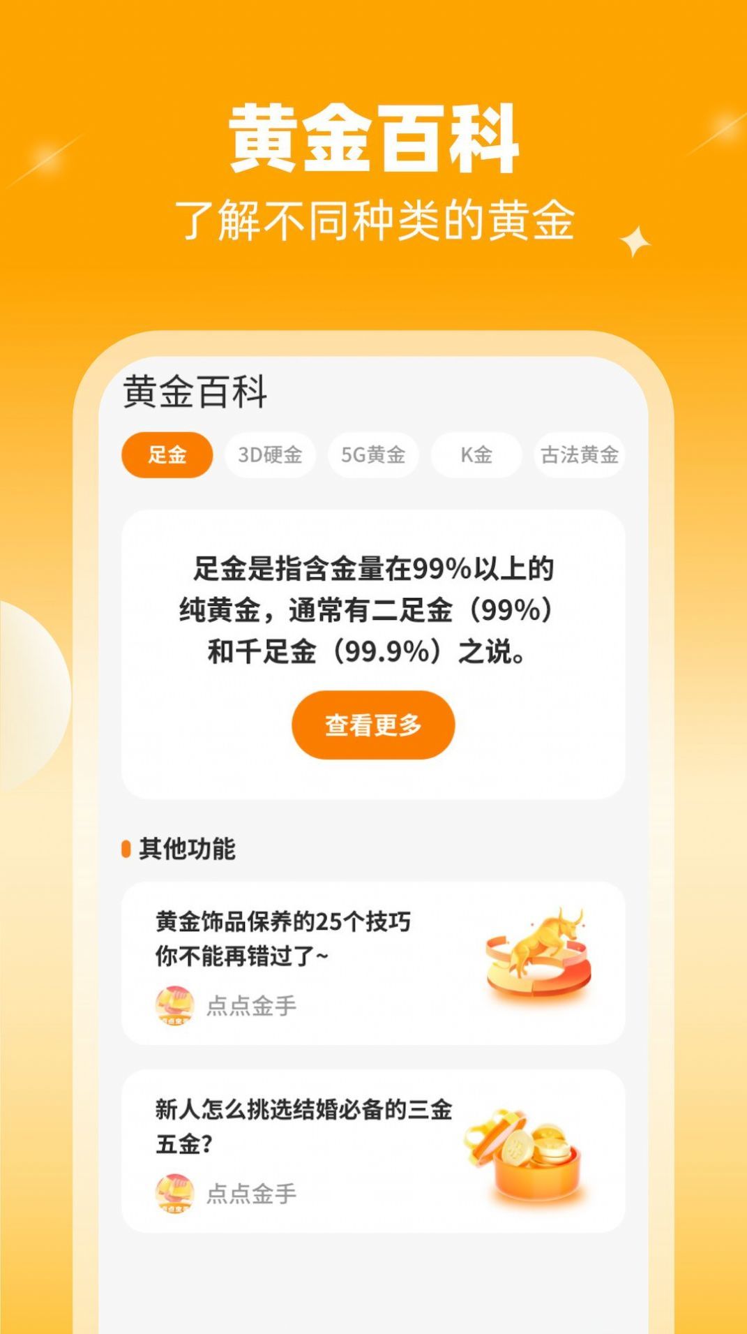 点点金手一款非常靠谱的黄金价格走势行情软件,让你学到更多黄金相关的知识知识,通过这款app你可以快速了解当前的黄金价格行情,一手掌握黄金价格走势,让你能够做出最正确的投资决策。点点金手是你掌中的黄金管家,如果你手上有黄金,或者有购买黄金的需求,可以试试这款app哦!
