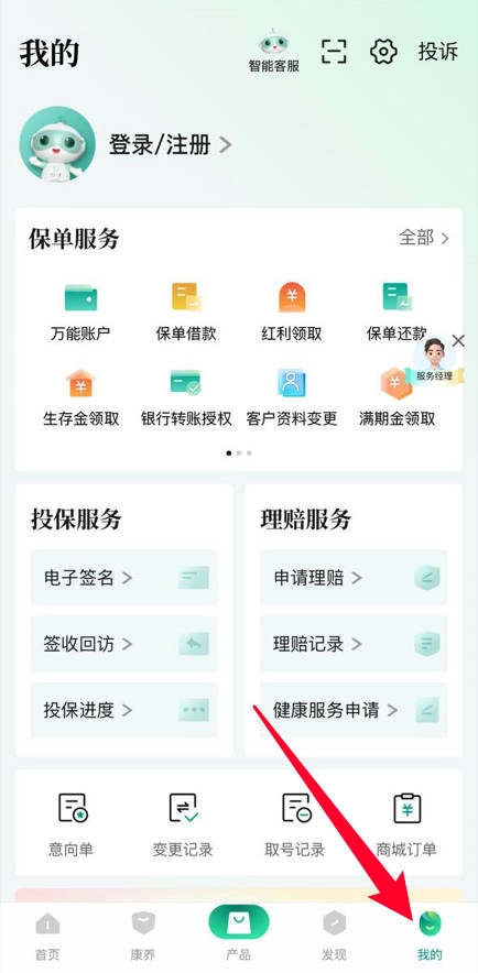 4、点击底部“我的”,可登录查看保单服务、投保记录、理赔申请等个人信息。