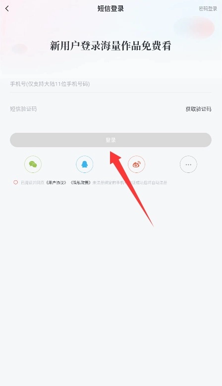 3、输入手机号码,获取并输入验证码点击登录,未使用的手机号将自动注册创建新账号。