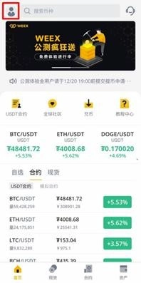 1、请在唯客交易所APP首页点击左上角的小人头像。