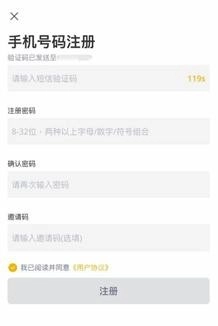 4、输入手机或邮箱验证码,设置密码,选填邀请码(如有),仔细阅读[用户协议]后进行勾选,点击【注册】。