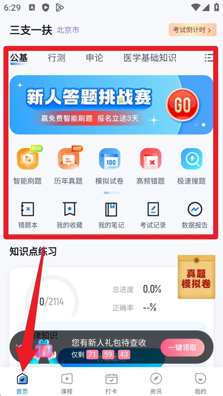 1. 打开 App 默认首页,可进入“智能刷题”“历年真题”等模块,点击对应图标即可开始练习。