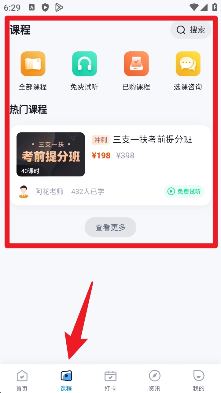 2. 点击底部“课程”页面进行切换,在众多课程中挑选“考前提分班”这类所需课程,既能够试看,也可直接购买学习。