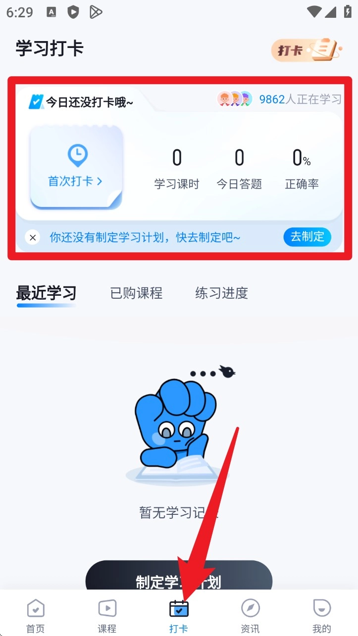 3. 点击下方“打卡”栏目,查看学习时长和答题数据,还能制定个性化学习计划。