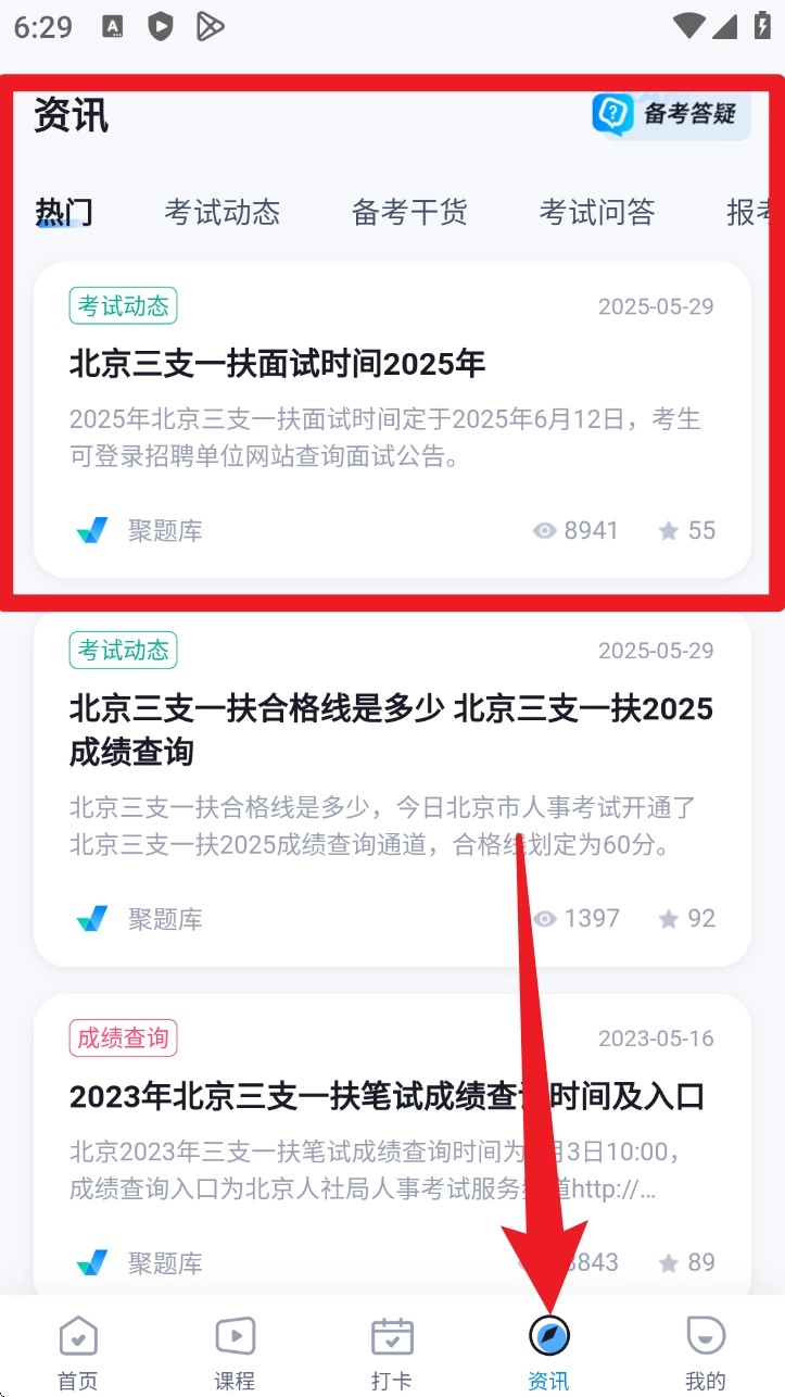 4. 进入“资讯”板块,就能浏览各地三支一扶考试的最新动态,第一时间获取考试公告及招录相关信息。