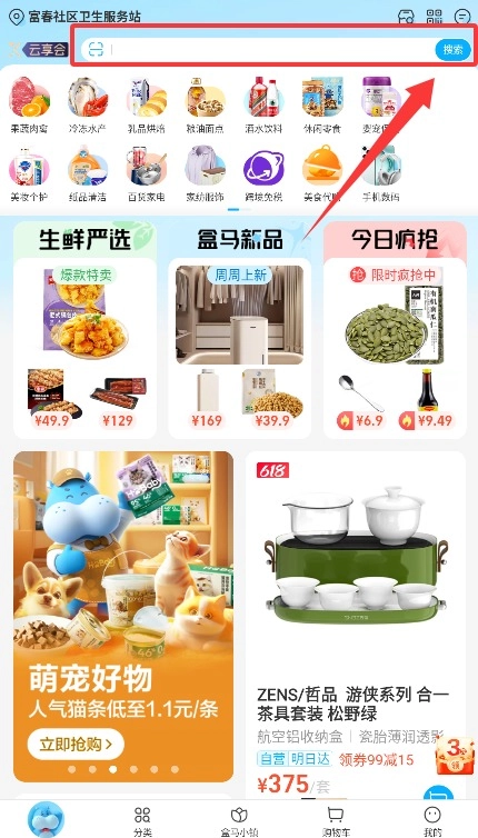 2、在顶部搜索栏输入商品名称或店铺关键词,快速查找需要的生鲜食品或日常用品。
