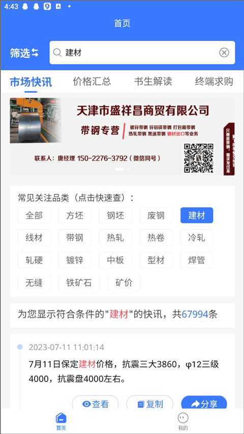 在市场快讯板块,能让你迅速获取钢坯、方坯、废钢以及建材的最新资讯。而价格汇总板块,整合了各地市场行情,助力你精准把握市场价格走向,从而更妥善地制定应对策略。总而言之,但凡与钢材相关的建材信息和价格,我们都能为你妥善处理。每日实时更新的数据,便于用户尽快做出判断。若用户有购买或出售需求,还可通过终端发布供需资源,与全国钢材生意伙伴建立业务往来。