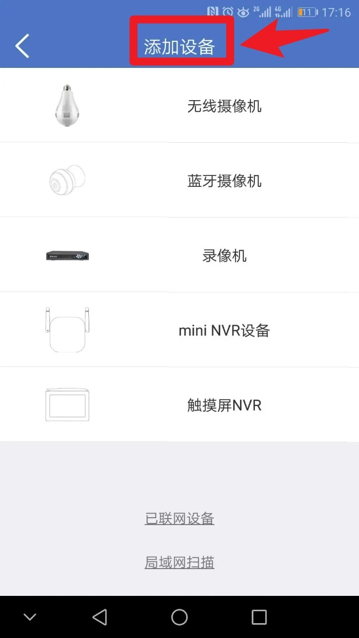 2. 登录后点击“添加设备”,根据提示选择无线摄像机、录像机等类型,完成配对与联网。