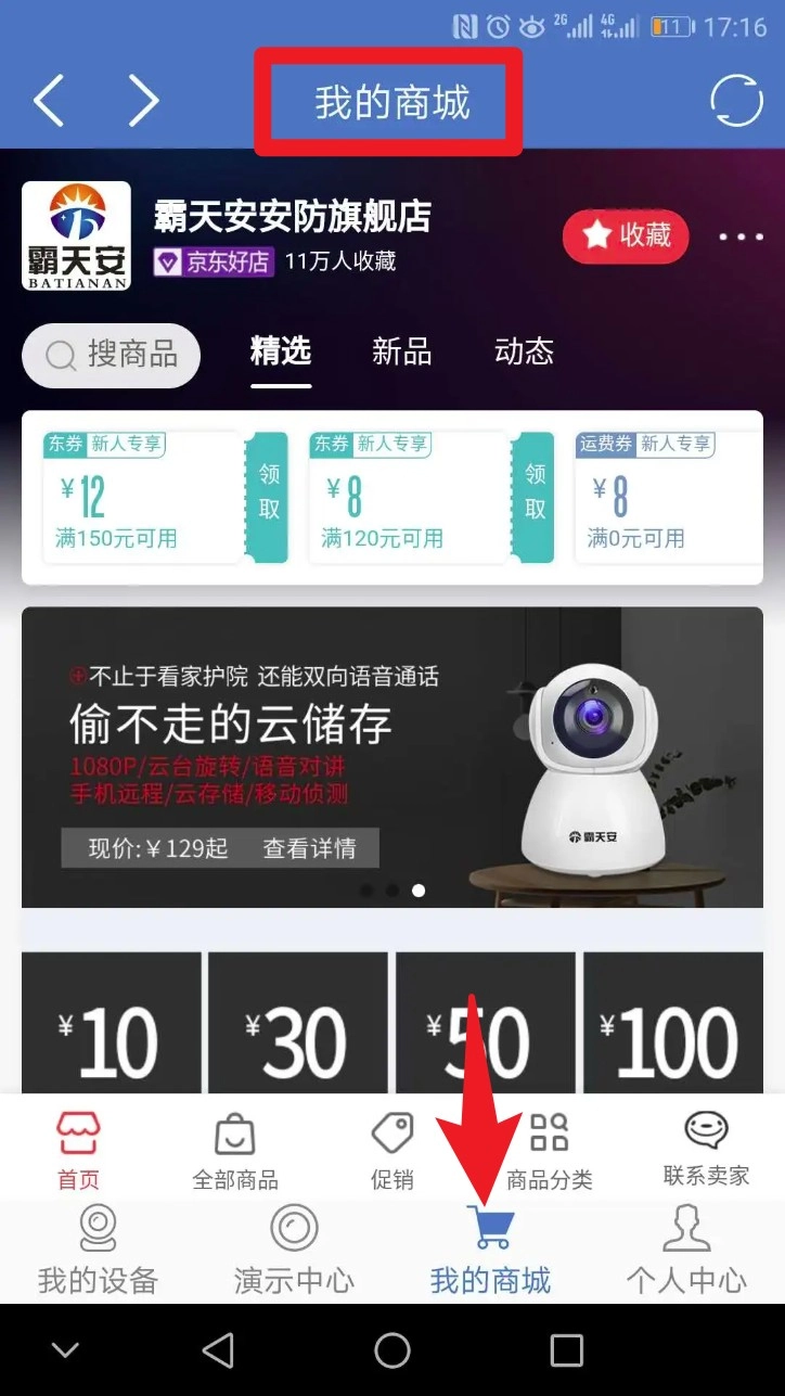4. 点击底部“我的商城”,可选购监控配件、查看订单优惠信息,支持一键下单和收藏店铺。