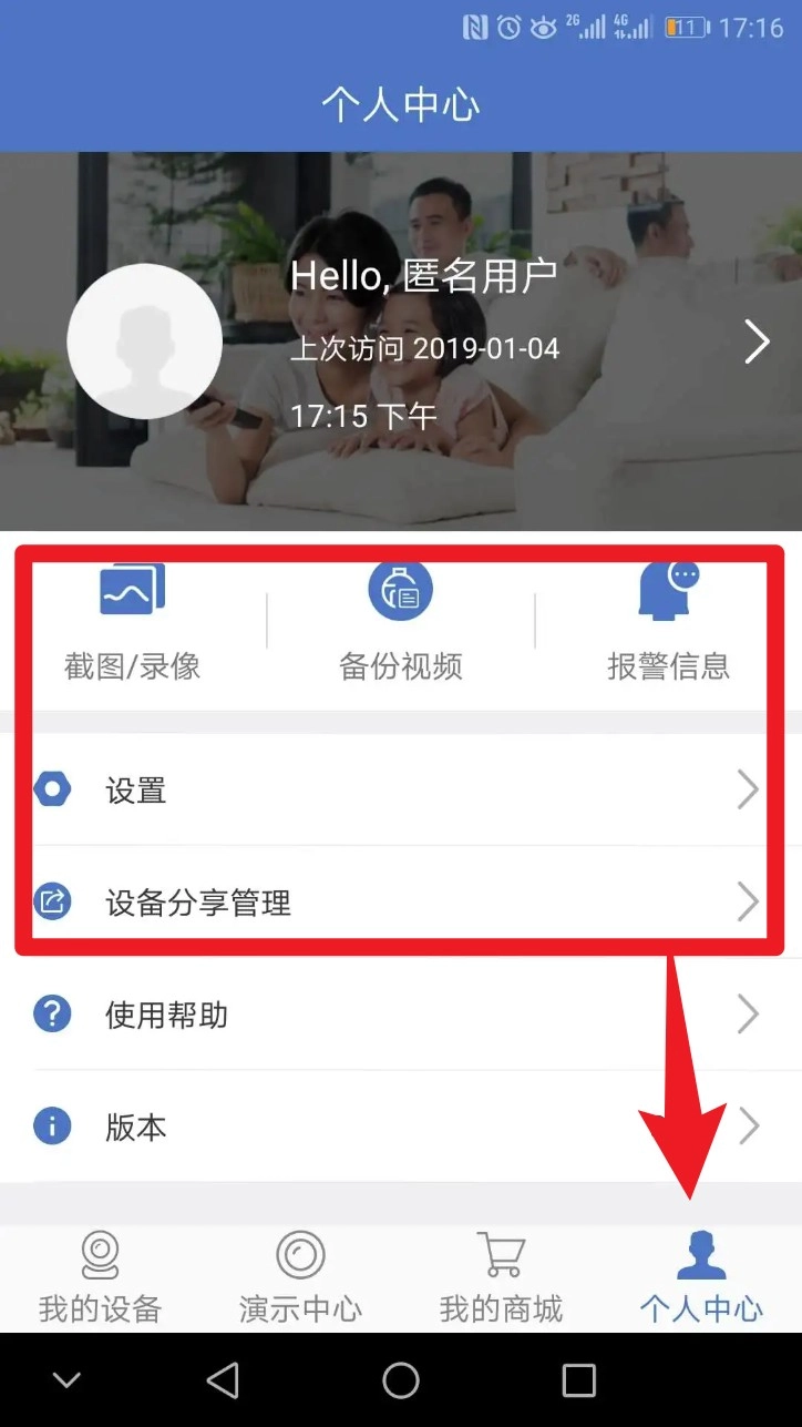 5. 在“个人中心”中可设置设备信息、查看备份视频、管理共享权限,也能随时提交使用反馈。