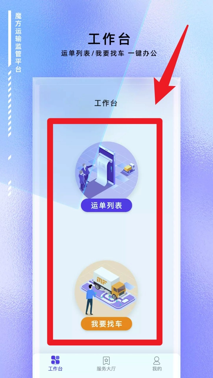 2. 成功登录后,点击底部导航栏的「工作台」,进入包含运单列表与找车功能的页面。