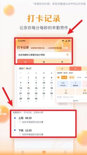 2、进入打卡记录页面后,用户可按日、周、月查看各项目的考勤情况,包括上下班打卡时间、打卡地点、出勤天数、平均工时与补卡信息。