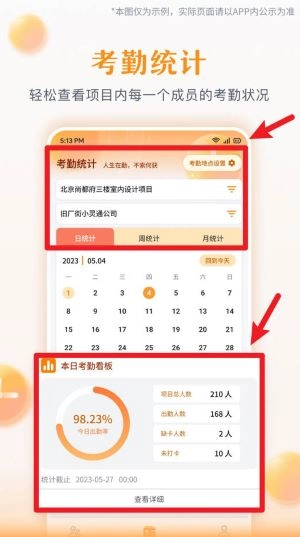 3、考勤统计页面支持按日、周、月方式切换,管理者可选择对应项目查看当日总人数、出勤人数、缺卡人数与未打卡情况,实时生成图表化出勤率。