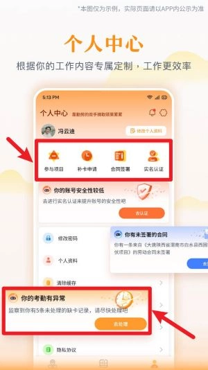 4、于个人中心页面,用户能够查看参与项目、补卡申请、合同签署以及实名认证的状态。与此同时,系统会对账户安全等级、未签署合同以及考勤异常状况进行提醒。