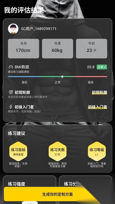 硬汉健身APP凭借简洁直观的界面以及强大的功能,助力每一位用户更科学、更高效地实现健身目标,进而开启充满健康活力的生活。1、打开硬汗健身app,填写自己的身体信息,系统会为你量身定制健身运动计划
