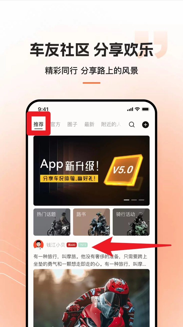 1. 打开首页,点击「车友社区」,在这里你能够浏览推荐帖、骑行日记,还可以发布动态,与其他骑士展开交流互动。