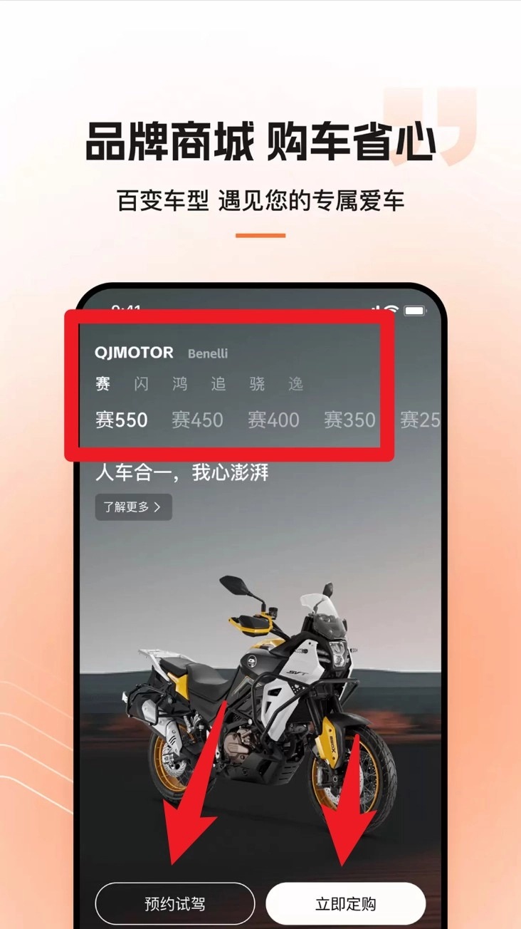 2. 进入「品牌商城」栏目,在浏览车型分类后,挑选自己心仪的车型,点击页面底部按钮,就能预约试驾或者在线购车。