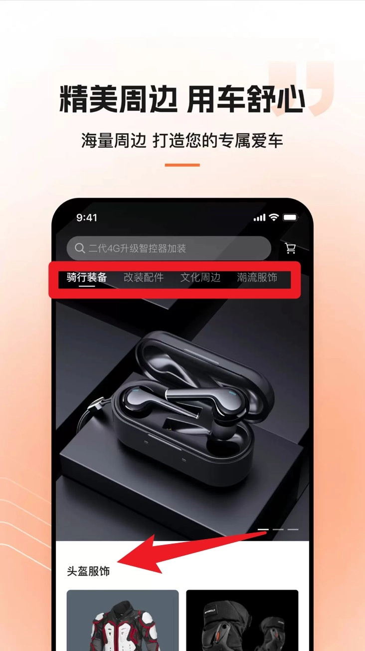 3. 在「精品周边」中选择分类,如骑行装备或改装配件,可浏览商品详情并直接下单购买。