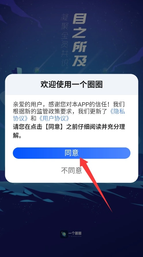 1. 首次启动圈圈APP,系统会展示用户隐私政策,认真阅读完毕后,点击同意按钮方可进入。