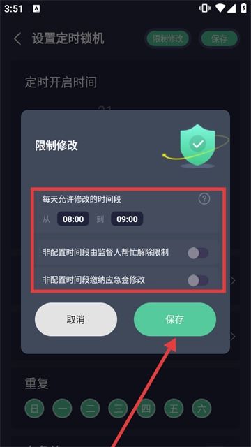 4、在限制修改页面,设置每天允许修改的时间段,选非配置时间段解除限制方式,点【保存】完成设置。
