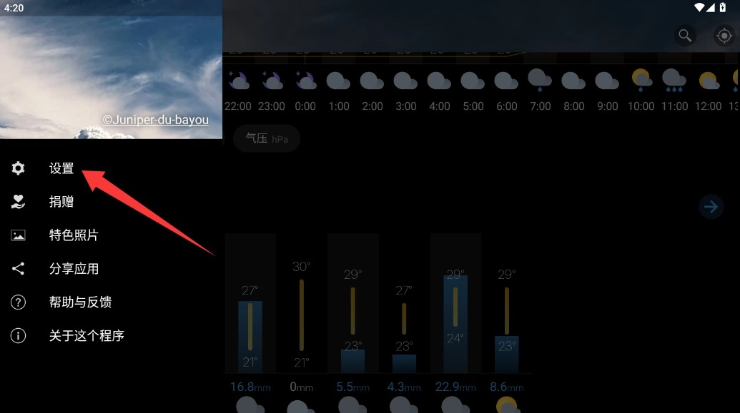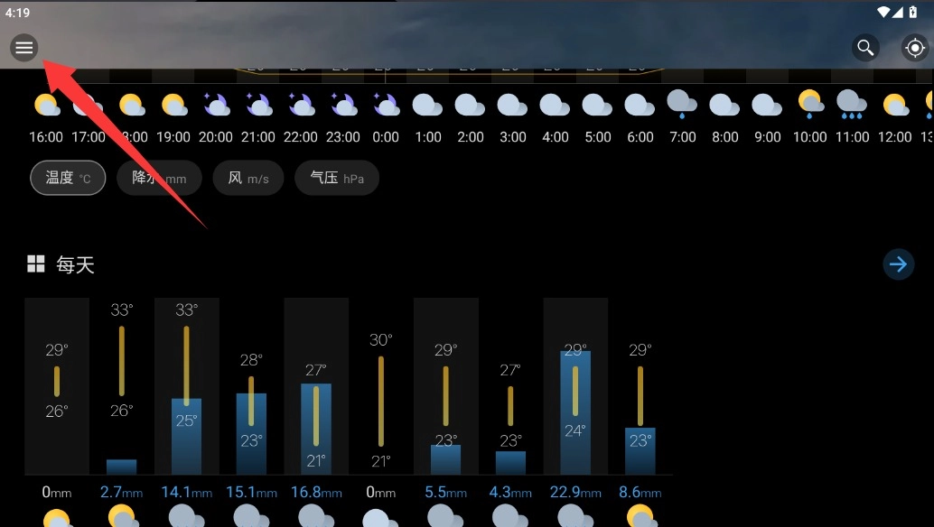 1. 开启Weawow天气APP,进入主界面后,在左上角找到三横线样式的菜单图标,轻轻点击该图标,就能展开侧边栏。