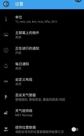 2、数据来源丰富,用户可自主挑选天气预报提供商。涵盖挪威气象局、Dark Sky等多个权威机构的数据。