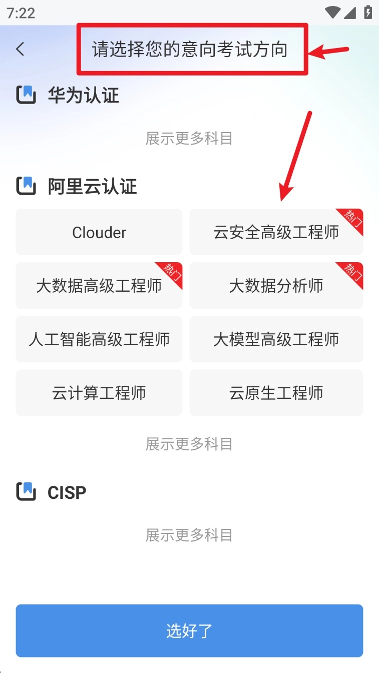 1. 首次打开 App 请选择考试方向,如华为认证、阿里云认证等,点击“选好了”进入主界面。