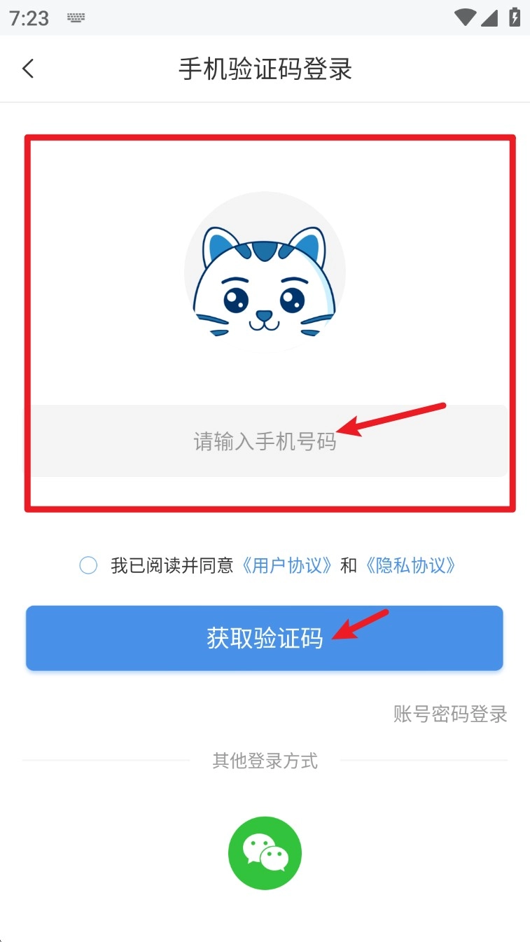 2. 选择登录方式,输入手机号并点击“获取验证码”,完成验证后即可进入应用首页。