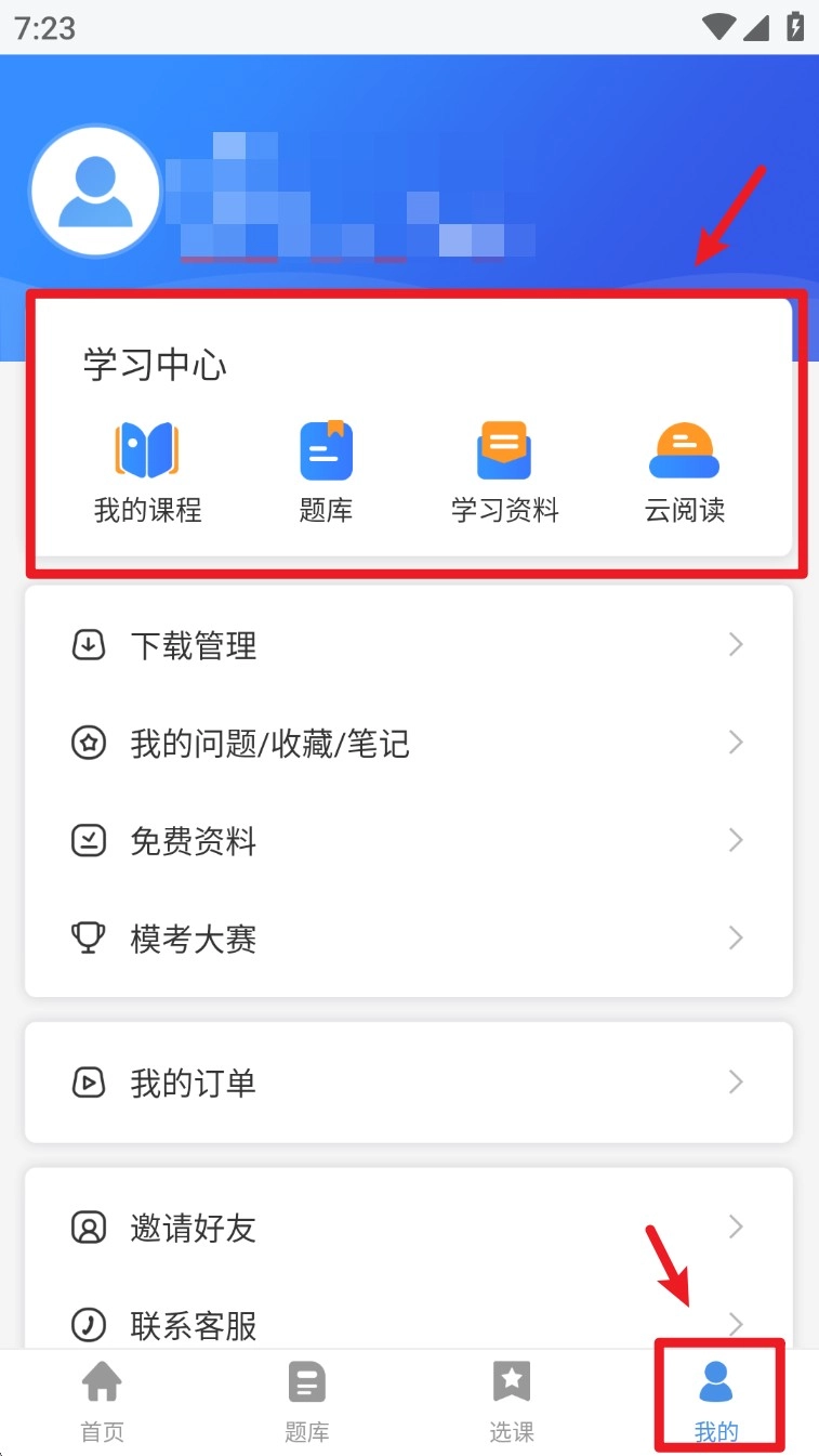 3. 点击底部“我的”进入个人中心,可查看课程、题库、学习资料与云阅读等模块。