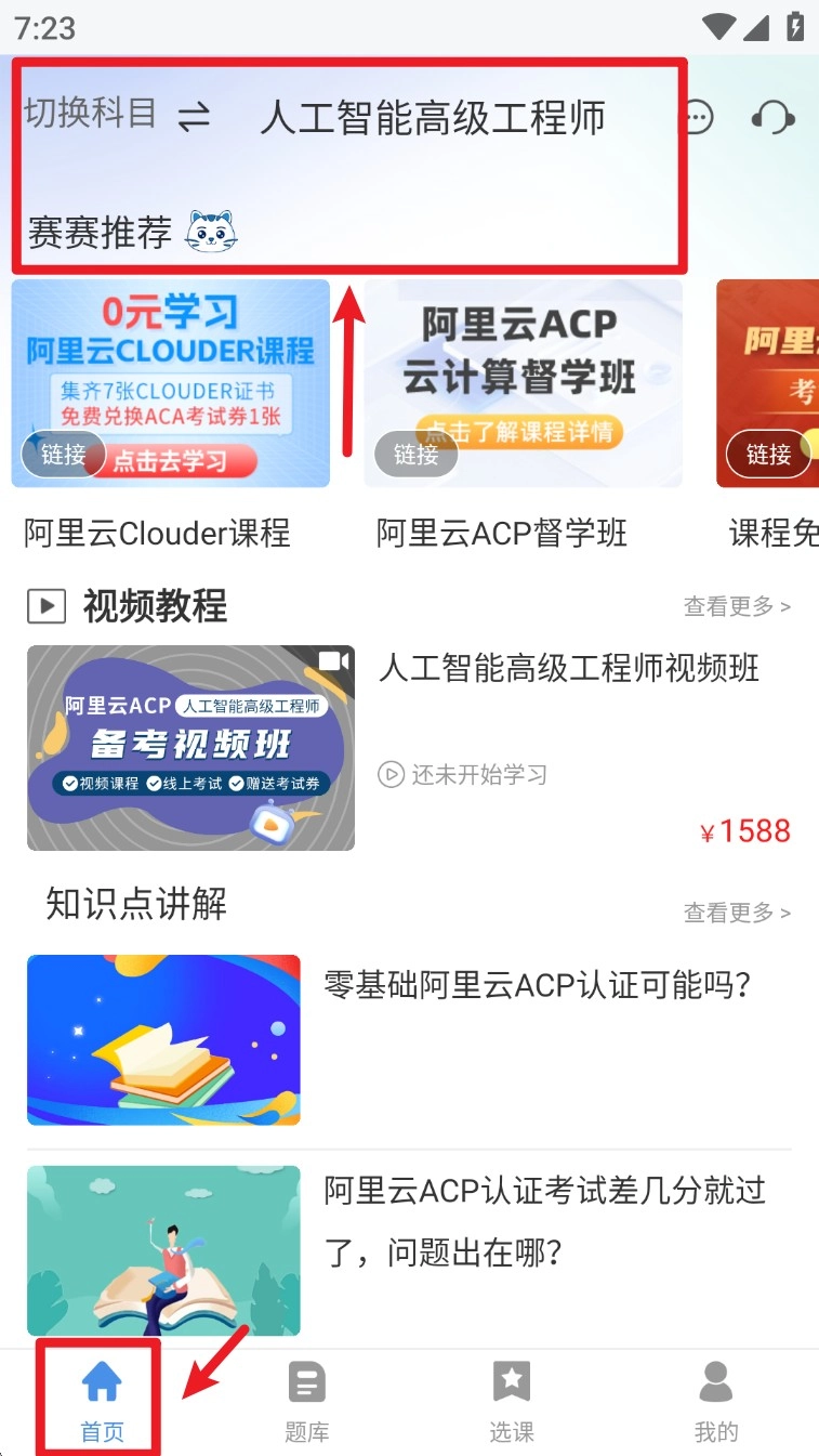 4. 返回首页点击顶部课程标签,浏览当前所选科目的视频课与推荐学习资源。