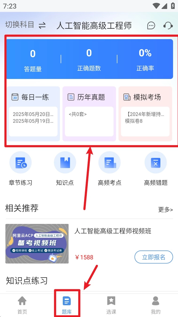 5. 轻点底部的“题库”,即可进入刷题区域,在此区域能够开展每日一练、练习历年真题以及参与模拟考场等操作。
