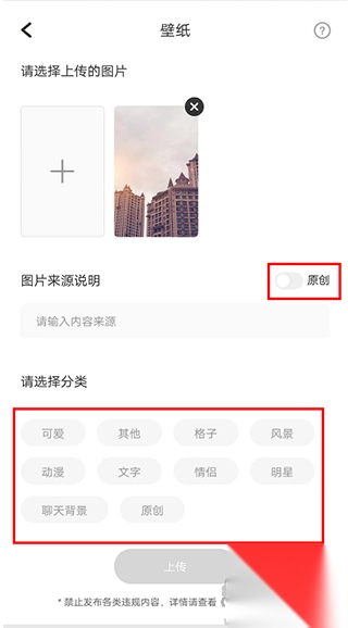 3、选择要上传的图片,填写图片来源,并选择对应的分类