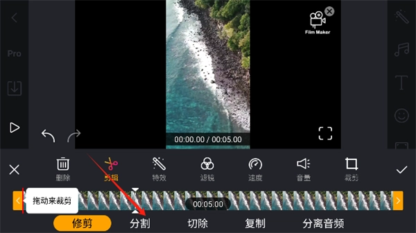 4、导入完成后可以对视频进行裁剪、分割、切除等多种功能。