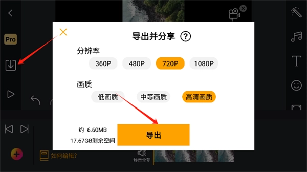 6、完成编辑后,点击左侧的下载按钮就能导出视频,而且视频导出时的分辨率与画质均可调整。