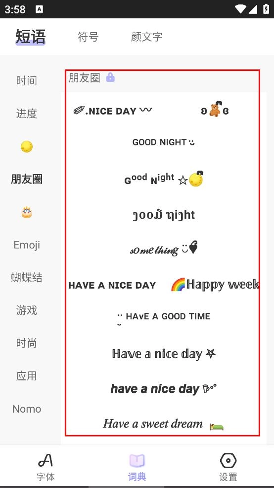 3、挑选文案短语:前往文案或短语板块,浏览推荐的内容,从中挑选合适的文案或短语,再搭配上自己喜爱的字体,即可直接应用于社交分享或者个人表达。