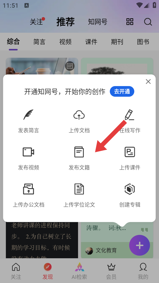 2、在创作功能菜单中,可以选择发布文籍等对应投稿类型,根据稿件形式选择合适的投稿入口。