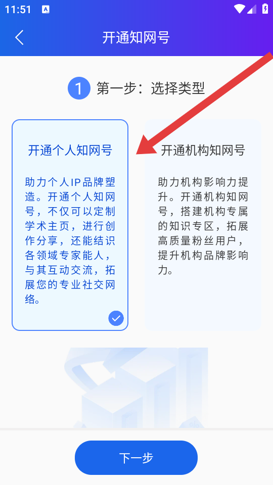 3、在投稿前需要先开通知网号,选择开通个人知网号,点击下一步完成账号开通,以便后续投稿的操作。