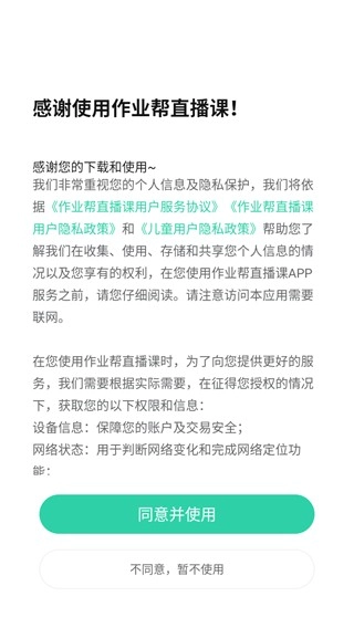 1. 在本站完成作业帮直播课的安装后,打开软件,需同意用户协议才能继续使用。