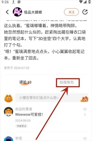3、在作品详情页向下滑动,找到“拍摄角色”这一功能选项。