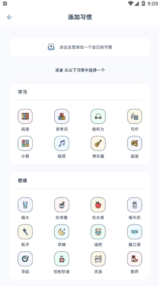 2、用户能够在习惯库内不同类别的习惯里,找到自己感兴趣的习惯并添加。