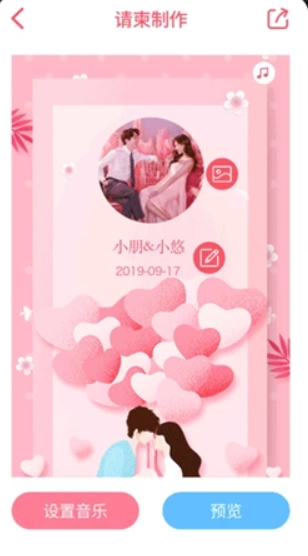 3、拓展素材库,涵盖音乐、边框、字体等多元元素,助力轻松打造更富创意的请柬。