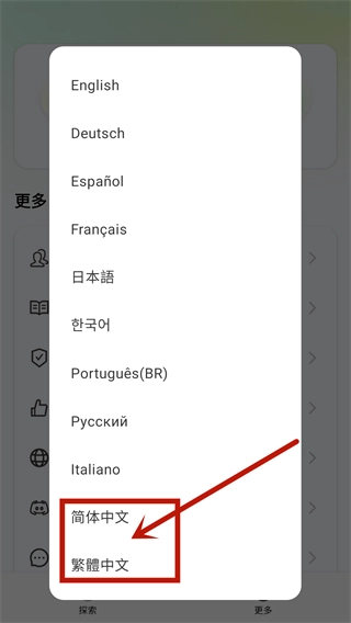 2、若需手动调整,可在“更多”选项里找到“语言”,接着选择“中文”。