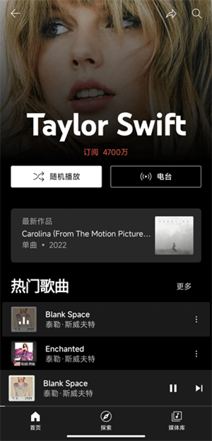 4. 顶部导航栏设有艺术家、专辑、歌曲以及播放列表等分类选项。