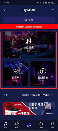 1. 在Fly音乐的【听歌】界面里,可搜索本地内存中的音乐,还能快速播放本地音频、“我喜欢”的音频以及最近播放过的音频。